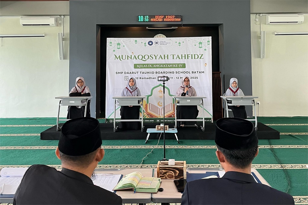 Pelaksanaan kegiatan Munaqosyah Tahfidz Kelas IX Angkatan IV pada Selasa (11/3) hingga Rabu (12/3). Kegiatan tersebut berlangsung di Masjid Daarut Tauhiid Batam dengan penuh semangat dan keberkahan.
